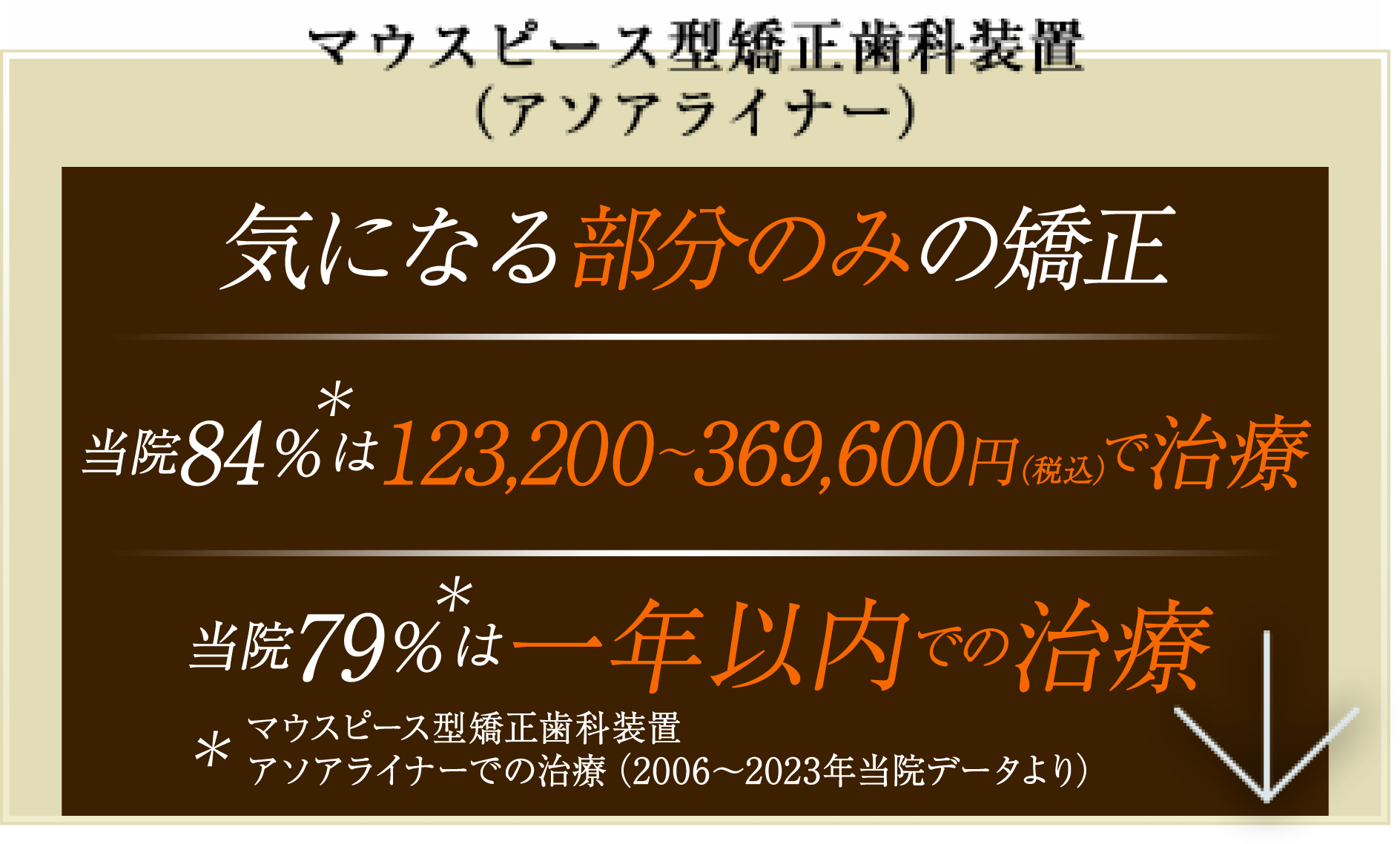 当院でのマウスピース型矯正歯科装置(アソアライナー)は使用する装置分だけのお支払いです。また当院では、装置製作に一手間かけることにより、できるだけ少ない装置の個数で治療できるよう努力しています。当院でマウスピース型矯正歯科装置(アソアライナー)で治療された方の84%はマウスピースの装置代123,200~369,600円(税別)です。(2006~2023年当院データより)